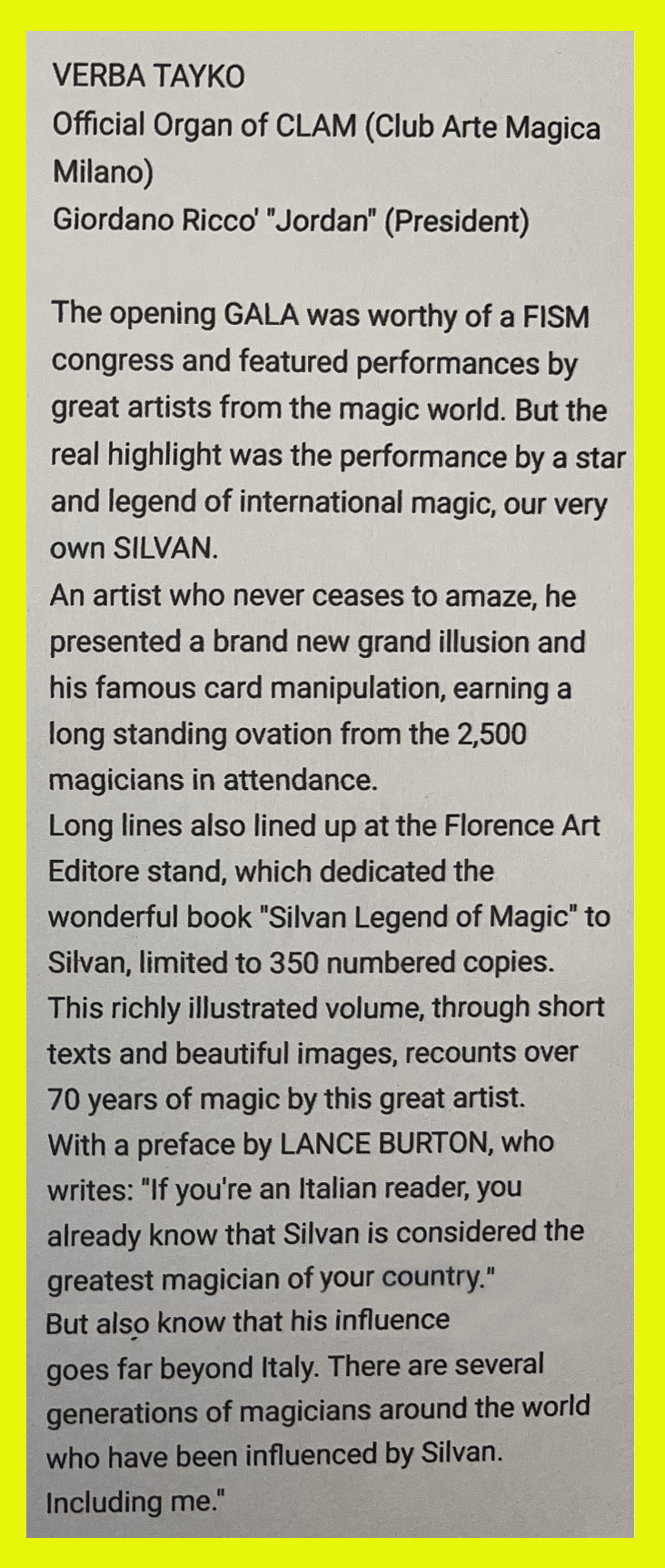STREPITOSO SUCCESSO E INTERMINABILE OVAZIONE PER SILVAN E LA SUA MAGICA COMPAGNIA: “STRAORDINARIO TRAVOLGENTE E SORPRENDENTE LO SPETTACOLO DI SILVAN : “I00 MINUTI DI IMPOSSIBILE !” HA RIEMPITO I 900 POSTI DEL TEATRO AURORA!” (La Nazione)